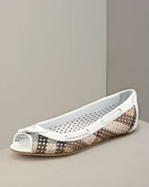 Burberry Shoes Okay I got so excited over Gwyneth's Burberry oxfords that I sort of just went on a Burberry shoe hunt. I found some great flats that would be ideal for summer!! I think both of these flats shown would look great with either a summer dress/skirt or even shorts :) I know the Burberry plaid can at times be just as cheesy as the LV monogram but I think these two flats are pretty demure in their plaid design. I also found the sling-back flats in the black and white plaid and I would probably go with that color combo instead of the original Burberry plaid colors. A note on perforation...I'm usually not into perforated items cus its pretty easy to make them look cheap but Burberry somehow made it work on these peep-toe flats.